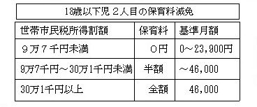 9月議会では保育料に関する条例改 正が行われ、18歳以下の第2子については右表に示すように世帯の所得により、無料になる世帯と2分の1になる世帯、減免なしの世帯に分かれます。所得割額30万1千円以上の人でも同時入園の世帯は2分の1の減免が受けられます。これまでは、第3子以降は全員無料ですが、保育園に同時に2人入園している世帯の2人目の保育料を所得制限なしで半額にしていました。共産党市議団は30万1千円以上の所得制限をなく し、第2子全員が 減免を受けられる よう要求しました。