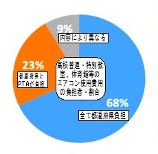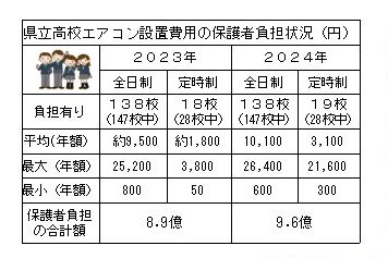 愛知県は、理科室など特別教室のエアコン使用料(設置費用含む)はPTA負担です。全日制で、最大2万6400円(1人平均年額:表参照)も負担する学校もあるなど学校間で大きな格差が生じています。PTA負担解消と未設置の特別教室や準備室へのエアコン設置も要望しました。全国47都道府県の高校エアコン使用費の負担状況を調査(愛知県議会事務局へ依頼)したところ、全額公費負担でのエアコン設置は64%・30都道府県を占め、使用料金を全額公費負担しているのは68%・32都府県と公費負担が多数派を占めています。愛知県は、設置費用、使用料とも県とPTAが負担する遅れた状況、早期の解消が求められています。